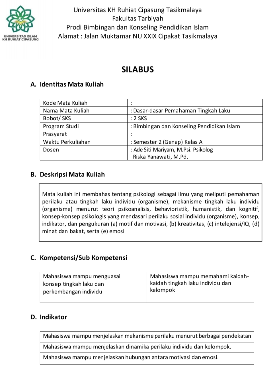 Silabus Mata Kuliah Dasar-dasar Pemahaman Tingkah Laku BKPI